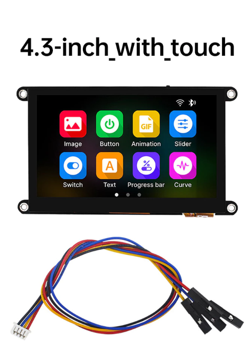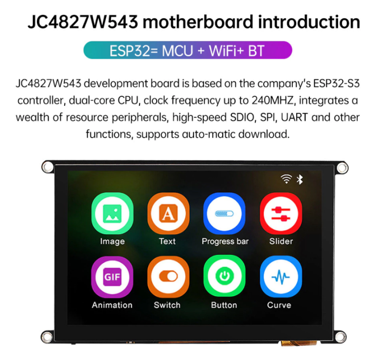 JC4827W543 uses ESP32-S3-WROOM-1 Module as the main control, the main control is a dual-core MCU, integrated WI-FI and Bluetooth functions, the main frequency can reach 240MHz, 512KB SRAM, 384KB ROM, 8MB PSRAM, Flash size is 4MB, 4.3 inch display resolution is 480*272, NTP (Without Touch Panel), RTP (Resistive Touch Panel), CTP (Capacitive Touch Panel) are optional.